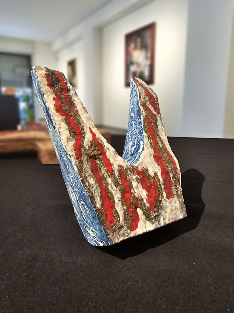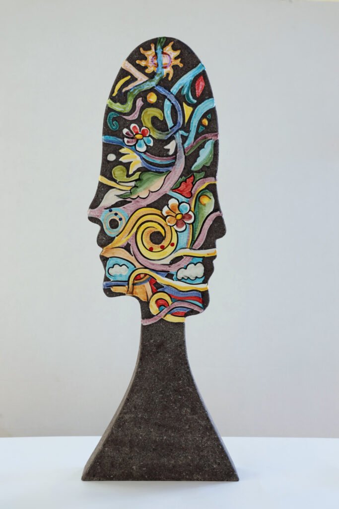 Dimensions: H 25 x W 75 x D 7 Kg. 16,8 Year: 2023 Country: Italy Technique: Scultura a tecnica mista. Roccia vulcanica dell’Etna e smalti, cottura a 950 gradi. Mixed technique sculpture. Volcanic rock from Etna and enamels, fired at 950 degrees. Signature: Yes Edition: Unique artwork